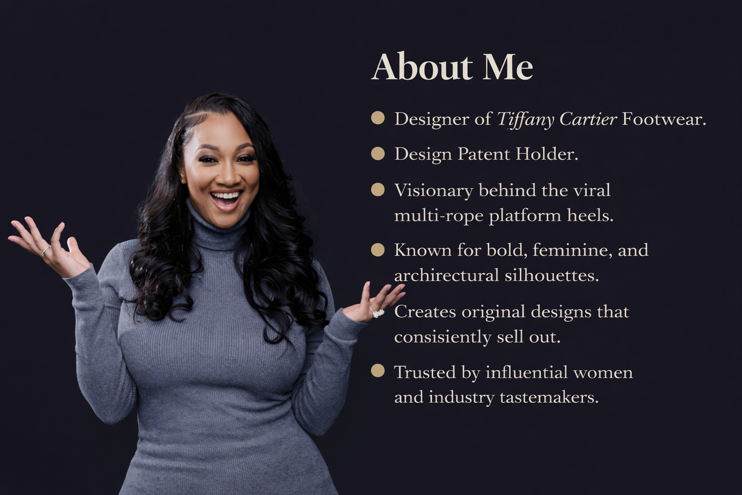 From the award-winning Brianna Multi Rope Platforms II, which earned a prestigious design patent, to limited-edition drops that consistently sell out, Tiffany Cartier Footwear is redefining modern statement shoes with creativity, craftsmanship, and intention.